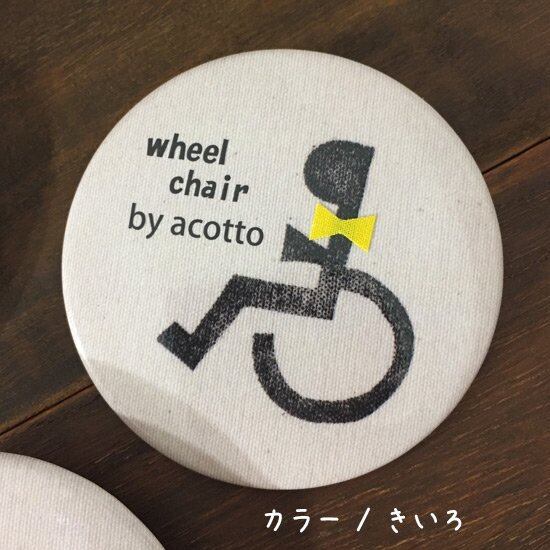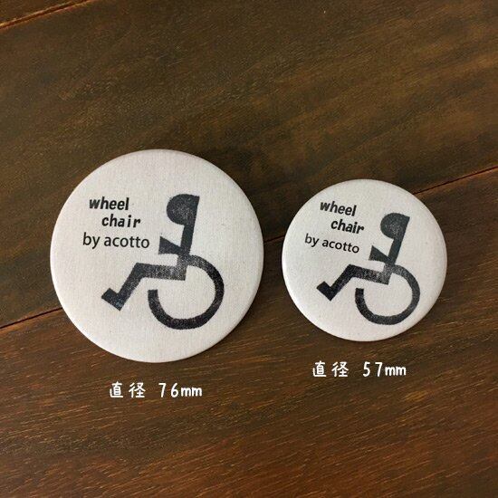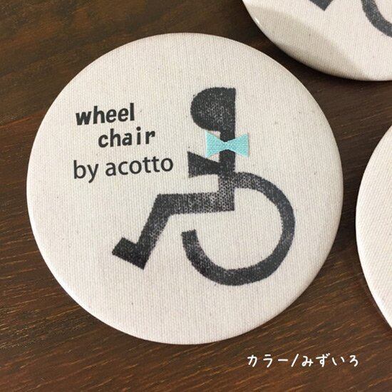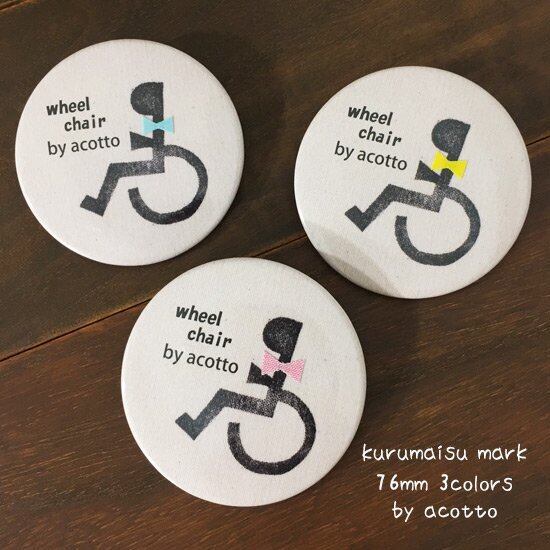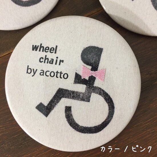 ノーマルタイプと蝶ネクタイ付きのおしゃれな車いすマークの缶バッチがあります。